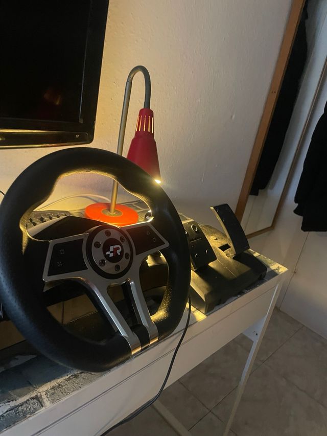 Volante de la marca Thrustmaster. - Diseño deportivo con acabado en cuero. - Base con pedales incluidos.