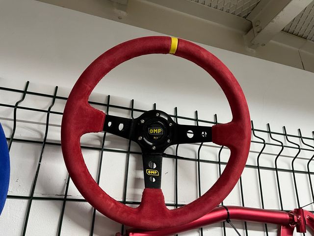 Volante deportivo tipo OMP, con acabado en piel vuelta rojo y detalles amarillos.