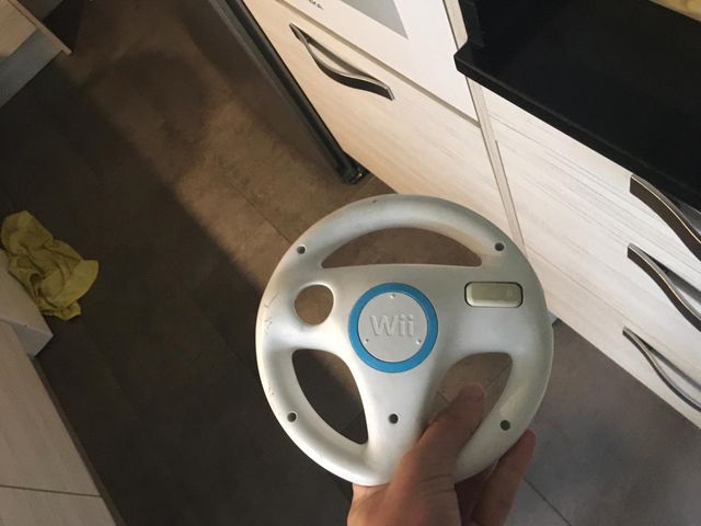 Volante accesorio para la consola Wii. - Diseño en color blanco. - Detalle azul en el centro con el logo de Wii.
