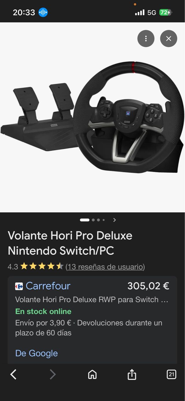 Detalles del productoVolante de carreras Hori Pro Deluxe con pedales, compatible con Nintendo Switch y PC. Ideal para una experiencia de juego inmersiva.