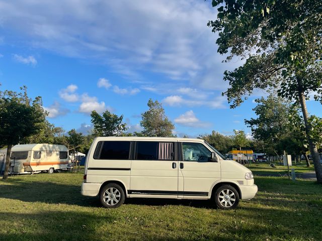 Preciosa Multivan T4 camper. Homologada como turismo, pasa la ITV anual (hasta noviembre de 2025). ABS, aire acondicionado, dirección asistida y velocidad de crucero. Cuenta con batería auxiliar alimentada por placa solar homologada en el techo (suficiente para llevar nevera de compresor en verano). Baño Potti. Distribución cambiada con 275.000 km. Motor irrompible. Preparada para hacer kilómetros y dormir en ella. Cama de 140 x 190 cm para dormir dos personas holgadamente. Colchón comodísimo plegable. Mesa y fregadero. Acepto prueba mecánica. Pruébala.