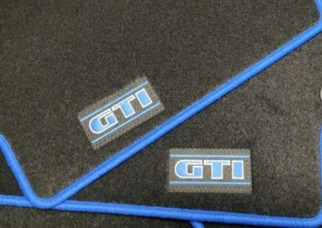 Juego de 4 Alfombras en Moqueta delanteras y traseras hechas a medida para Volkswagen Golf 3 III Mk3 de 3/5 puertas con logo Gti modelos de 1992 a 1997,también para Golf 3 y 4 Cabrio, contorno en lana cosida con hilo Azul, clips anclajes de fijación incluidos con fijaciones al suelo, nuevas a estrenar.