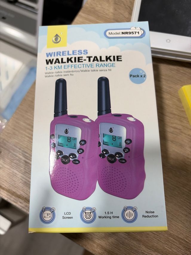 Detalles del productoSet de dos walkie talkies inalámbricos en color rosa, ideales para comunicarse a distancias de hasta 3 km.