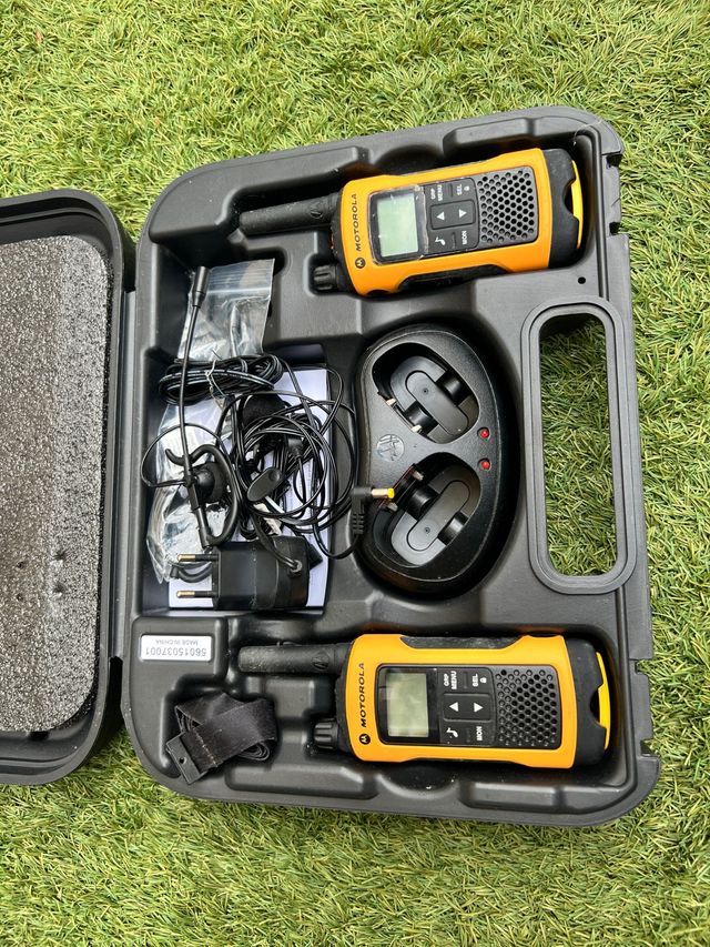 Detalles del productoSet de dos walkie talkies Motorola en color naranja, perfectos para comunicación.