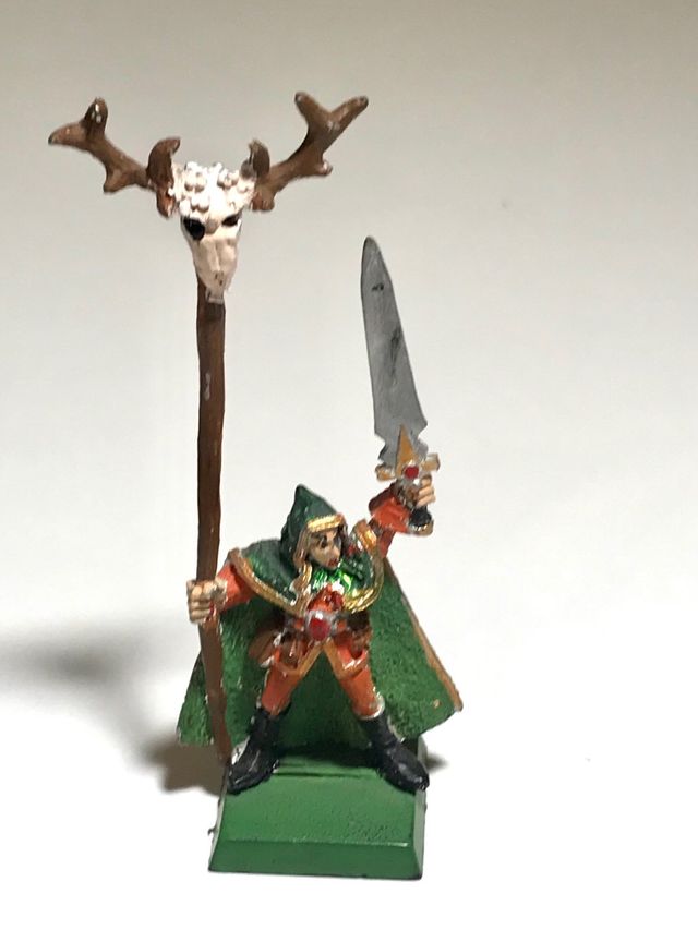 Detalles del productoFigura de Warhammer de un Guardián Elfo. La figura está pintada (ver fotos) y lista para coleccionar o jugar. Dificil de encontrar.