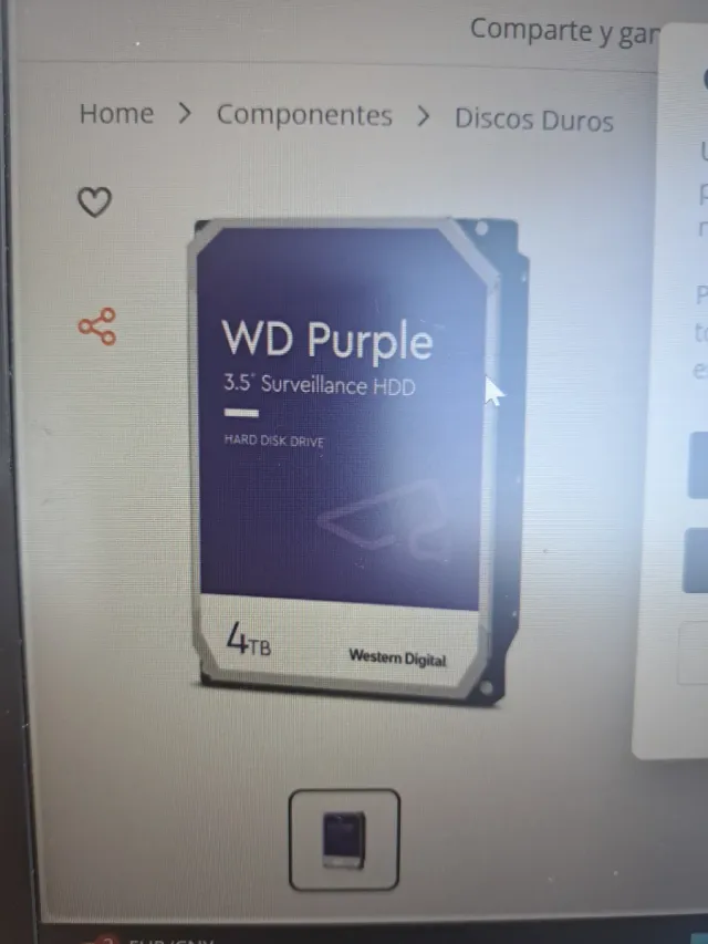 Disco duro WD Purple de 4TB para vigilancia. - Capacidad: 4TB - Tipo: HDD (Disco Duro) - Serie: Purple (para vigilancia) - Formato: 3.5 pulgadas