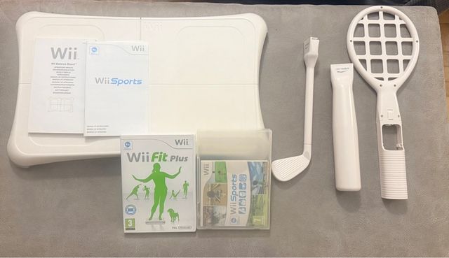Incluye la tabla Wii Balance Board y el juego Wii Sports. - Tabla Wii Balance Board. - Juego Wii Sports. - Juego Wii fit plus - Instrucciones - Accesorios: raqueta, palo de golf y bate
