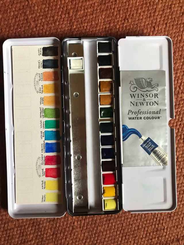 - Los colores son: Ivory Black, Payne's Gray, Burnt Sienna, Raw Sienna, Yellow Ochre, Permanent Sap Green, Winsor Green, Winsor Blue, French Ultramarine, Alizarin Crimson, Winsor Red, Winsor Yellow, Lemon Yellow y Chinese White.