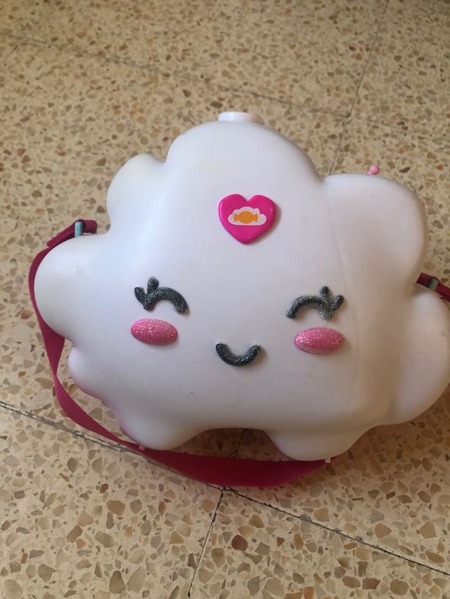 Bolso en forma de nube, con molinillo interior en forma de gota. 25 figuras incluidas que puedes enlazarlas, hacer pulseras o jugar con ellas Casi sin uso, como nuevo.