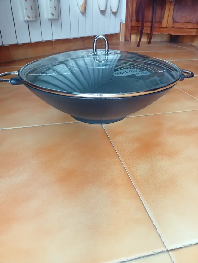 Detalles del productoWok de hierro fundido con tapa de cristal. Ideal para cocinar una gran variedad de platos.
