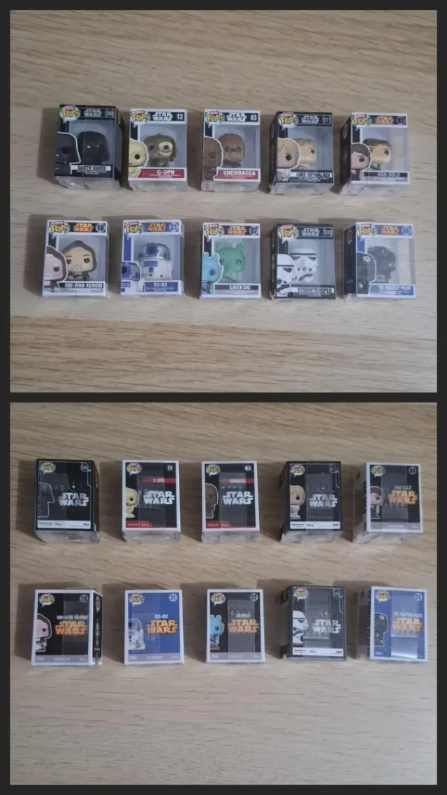 Vendo 10 figuras bitty pop de Star Wars. Incluyen: Darth Vader, Greedo, Obi-Wan Kenobi, Han Solo, Chewbacca, Stormtrooper, The Fighter Pilot, C-3P0, Luke Skywalker y R2-D2.