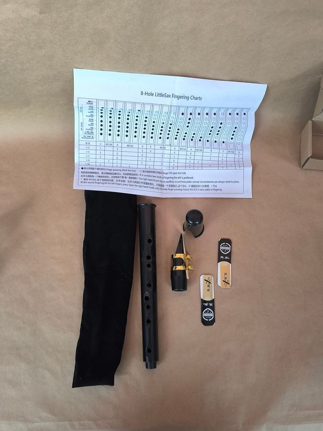 Instrumento de viento portátil tipo saxofón de bolsillo (estilo Xaphoon), nuevo a estrenar. Cuerpo de ABS con 8 orificios, utiliza boquilla y caña como saxofón/clarinete para un sonido cálido y potente. Tamaño compacto, ideal para iniciación, práctica y experimentación musical. Incluye tabla de digitación para empezar al momento.
