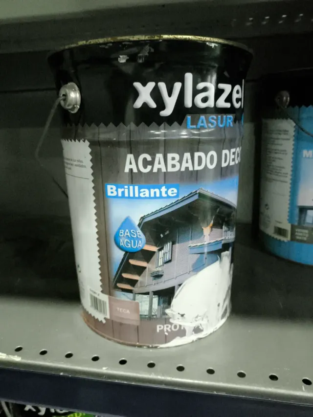 Protector para madera Xylazel. - Lasur de acabado brillante. - Base agua. - Color teca. - Formato de 5 litros.