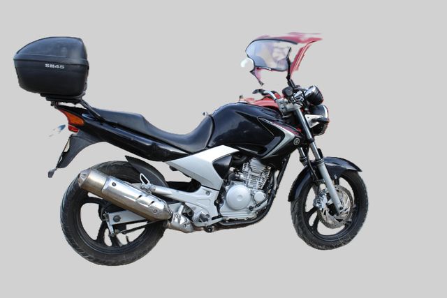 Moto Yamaha estilo naked en colores negro y plateado. Cuenta con un maletero trasero y una cúpula. - Maletero SH45. - Cúpula delantera. -57.000km