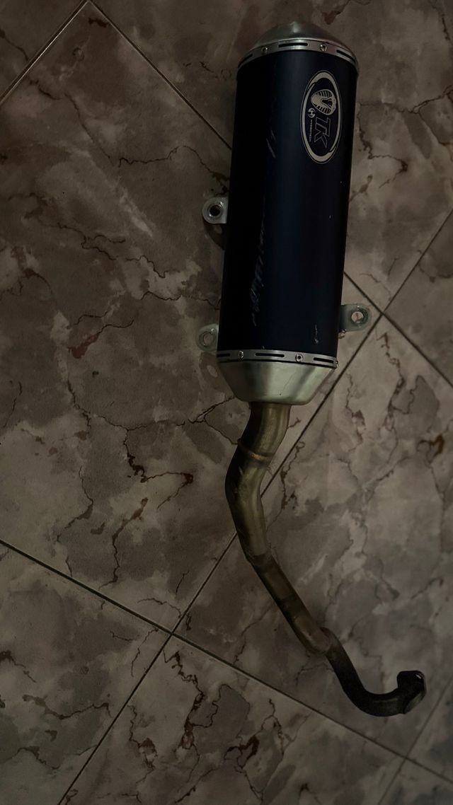 Detalles del productoTubo de escape de la marca TK, diseñado para motocicletas.