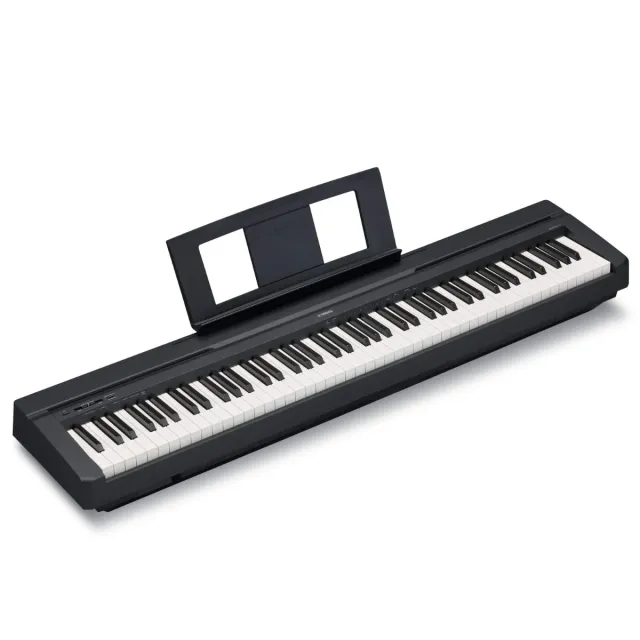 Piano digital Yamaha P45 en color negro. Incluye atril y pedal. - Diseño compacto y ligero. - Teclado contrapesado GHS. - Sonido de piano de cola. - Altavoces integrados.