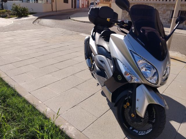 Maxi-scooter Yamaha TMAX de color plateado. - Diseño deportivo y elegante. - Parabrisas oscuro. - Asiento doble. - Baúl trasero.