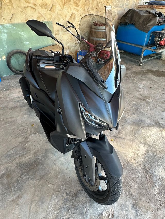 Scooter Yamaha XMAX 300 en color negro mate. - Diseño moderno y deportivo. - Parabrisas alto para mayor protección. - Espejos retrovisores integrados.