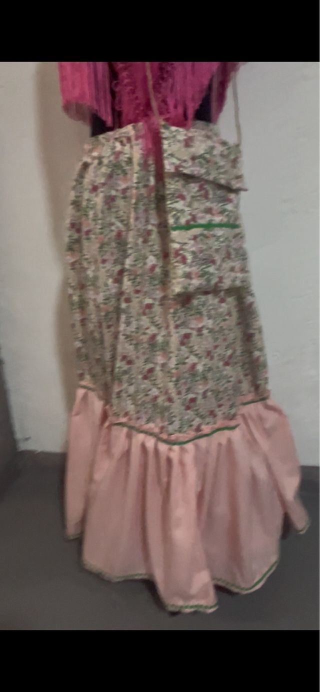 Zagalejo largo con estampado floral y detalles en verde. - Diseño con volantes en la parte inferior. - Incluye un pequeño bolso a juego.