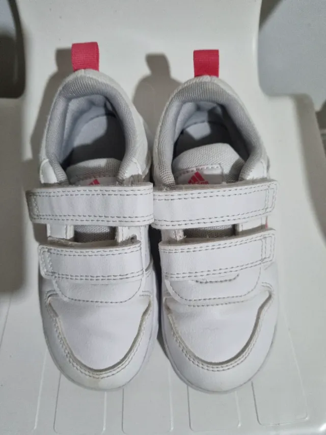 Zapatillas deportivas Adidas número 25. Cierre de velcro para mayor comodidad. - Color blanco con detalles y logo en rosa. - Suela de goma. - Diseño deportivo.
