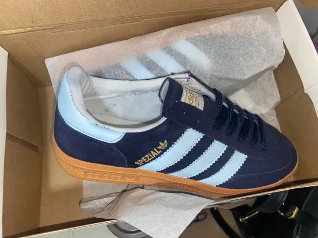 Zapatillas deportivas Adidas Spezial en color azul marino y detalles en azul claro. - Diseño clásico. - Suela de goma. - Logo de Adidas y Spezial en dorado.