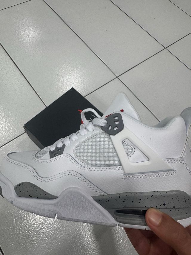 Detalles del productoZapatillas deportivas Air Jordan 4 en color blanco y gris. Diseño icónico con detalles en gris moteado.