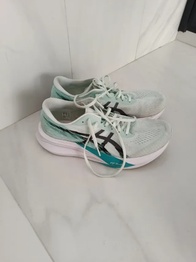 Zapatillas de running Asics Magic Speed 3 en talla 44.5. - Usadas para 150 km. - Color menta y negro. - Suela blanca con detalles turquesa.