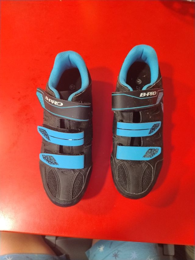 Detalles del productoZapatillas de ciclismo de montaña B-PRO, ideales para tus rutas. Son de color negro y azul, con tres cierres de velcro. Están en buen estado.