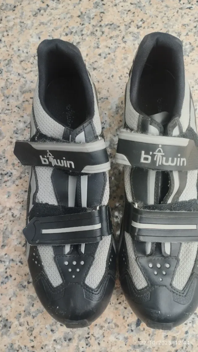 Zapatillas de ciclismo Btwin en color gris y negro. Talla 44. - Cierre con velcro. - Suela con tacos. - Diseño deportivo. Usadas 2 meses en gym.