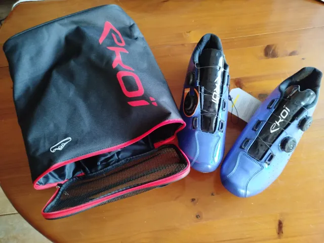Zapatillas de ciclismo de la marca Ekoi en color azul brillante. Incluyen bolsa de transporte. - Cierre BOA. - Suela rígida. - Diseño deportivo.