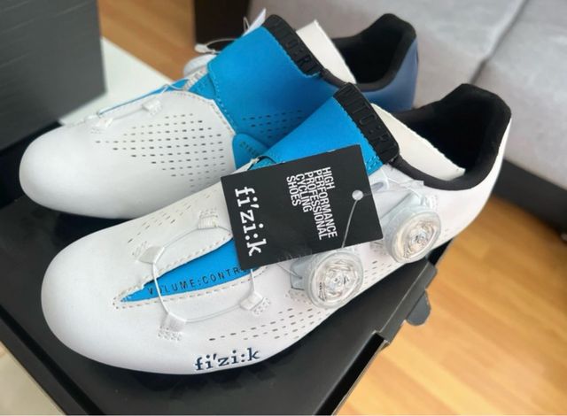 Detalles del productoZapatillas de ciclismo FIZIK R1 EVO en color blanco y azul. Cierre BOA. Nunca se han usado. Originales en su caja con etiquetas y protecciones. Edición Movistar.