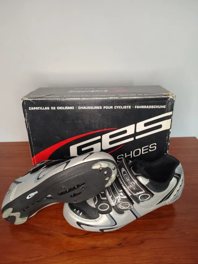 Zapatillas de ciclismo marca GES en color plata y negro. Ideales para carretera. - Cierre con velcro. - Suela con anclaje para calas. - Talla 38