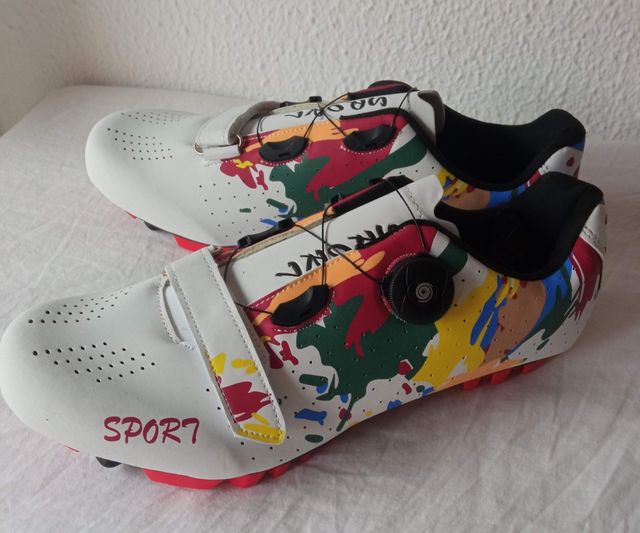 Zapatillas de ciclismo sin estrenar, con diseño moderno multicolor y cierre de ruleta + velcro para mayor ajuste y comodidad.