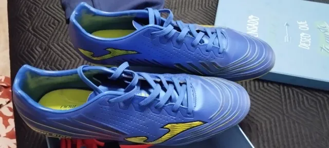 Zapatillas de fútbol Joma en color azul. - Diseño deportivo. - Logo Joma en amarillo. - Cordones azules. Talla 45'5 Usadas en dos ocasiones