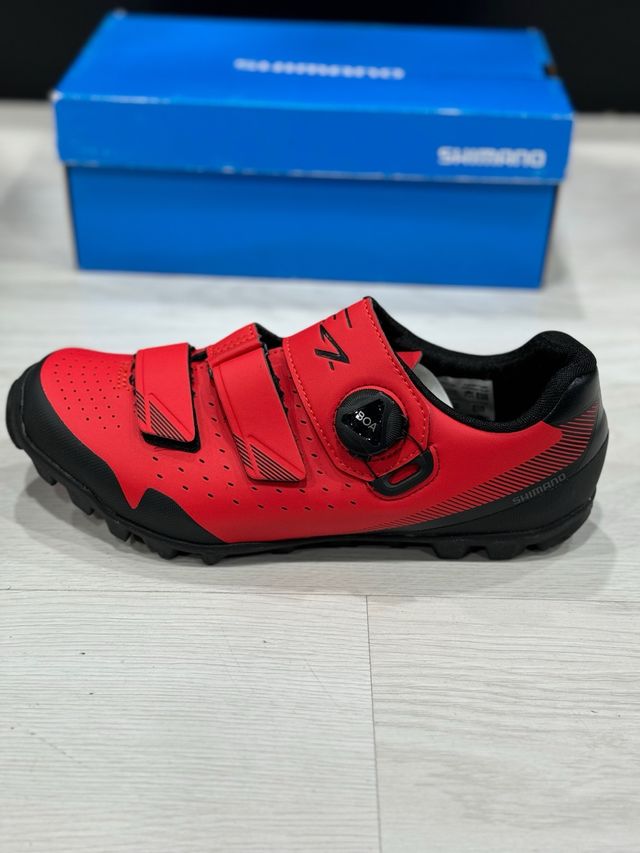 Detalles del productoZapatillas de MTB Shimano ME4 (SH-ME400), completamente nuevas en color rojo y talla 41. Diseñadas para rendimiento en montaña y trail, cuentan con una suela de goma Michelin® que ofrece excelente tracción y estabilidad al caminar. Su estructura incluye una entresuela reforzada con fibra de vidrio para mejorar la eficiencia en la pedalada. Incorporan un cierre BOA® L6 y una correa de velcro, proporcionando un ajuste preciso y seguro. Ideales para rutas técnicas y largas jornadas en bici. ¡Nuevas y listas para usar!