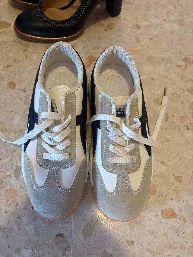 Zapatillas deportivas beige y blancas dice 40