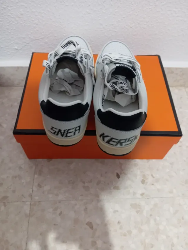 Zapatillas deportivas de color blanco con detalles en negro. - Cordones con texto. - Detalle de texto en la suela.