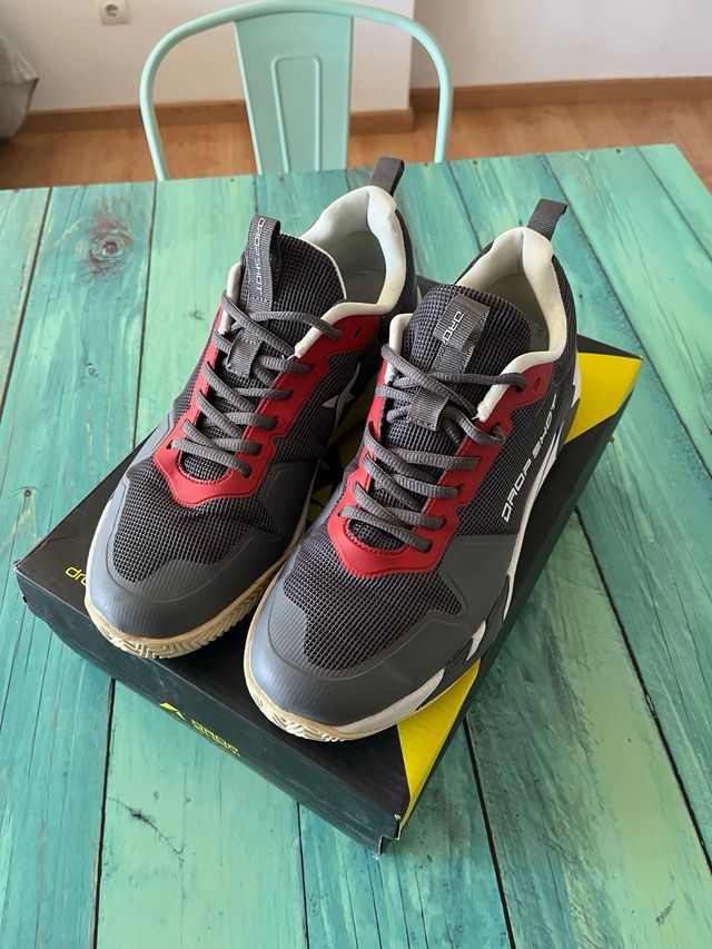 Zapatillas deportivas de la marca DROP SHOT. - Color gris con detalles en rojo y blanco. - Cierre de cordones. - Suela de goma.