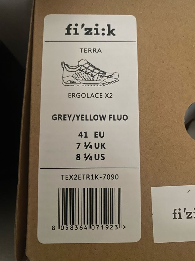 Detalles del productoZapatillas Fizik Terra Ergolace X2 en gris y amarillo flúo, talla 41 EU (7 1/4 UK, 8 1/4 US). Son un par de zapatillas sin apenas uso, estan nuevas. Se entregan sin calas.