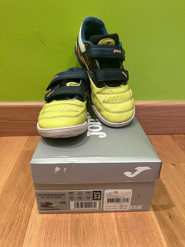 Zapatillas de fútbol sala Joma para niño en color amarillo y azul. - Talla 32 EUR. - Cierre de velcro. - Modelo: CARCHAR208.