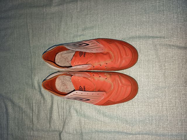 Zapatillas de futsal Umbro en color naranja, talla 40. Diseñadas para ofrecer comodidad y rendimiento en la cancha.