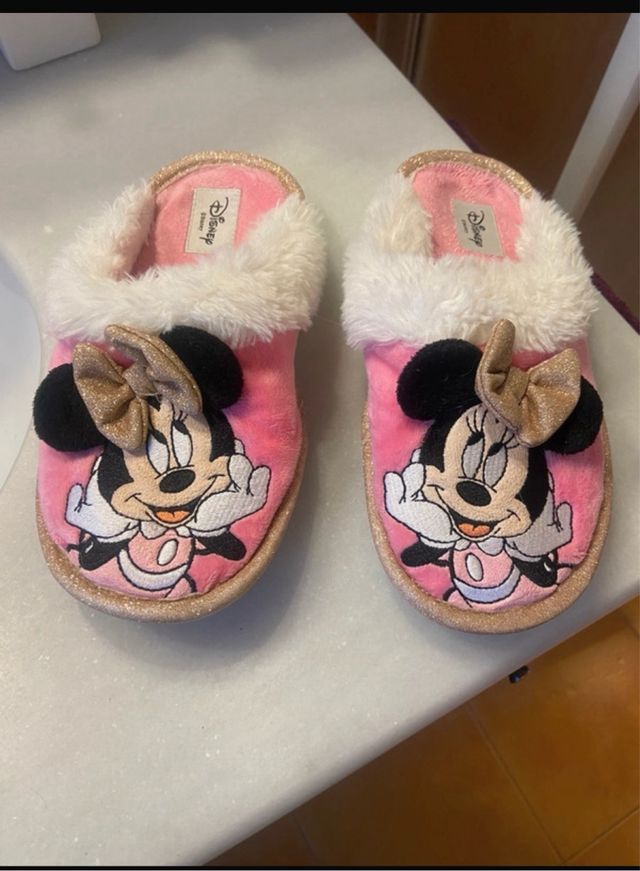 Adorables zapatillas de estar por casa con el personaje de Minnie Mouse de Disney. El exterior es de un suave color rosa con detalles brillantes en el borde y un lazo dorado.
