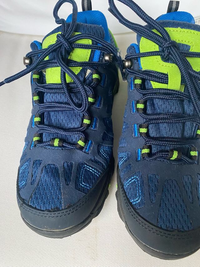 Detalles del productoZapatillas de montaña para niño, ideales para aventuras al aire libre. Son de color azul marino con detalles en verde lima y azul claro. Waterproof.