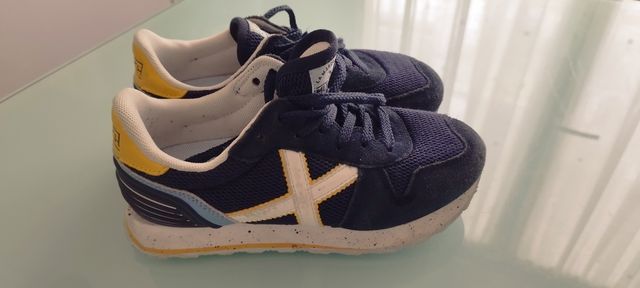 Zapatillas Munich para niño, talla 34. Ideales para el día a día. - Color azul marino con detalles amarillos. - Material textil y ante. - Suela de goma.