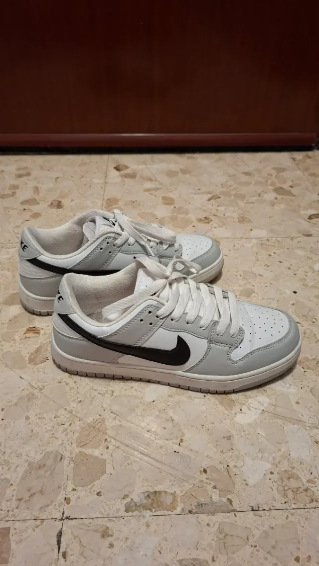 Zapatillas deportivas Nike para mujer, combinando tonos grises y blancos. - Diseño bajo. - Cierre con cordones blancos. - Swoosh lateral en color negro.