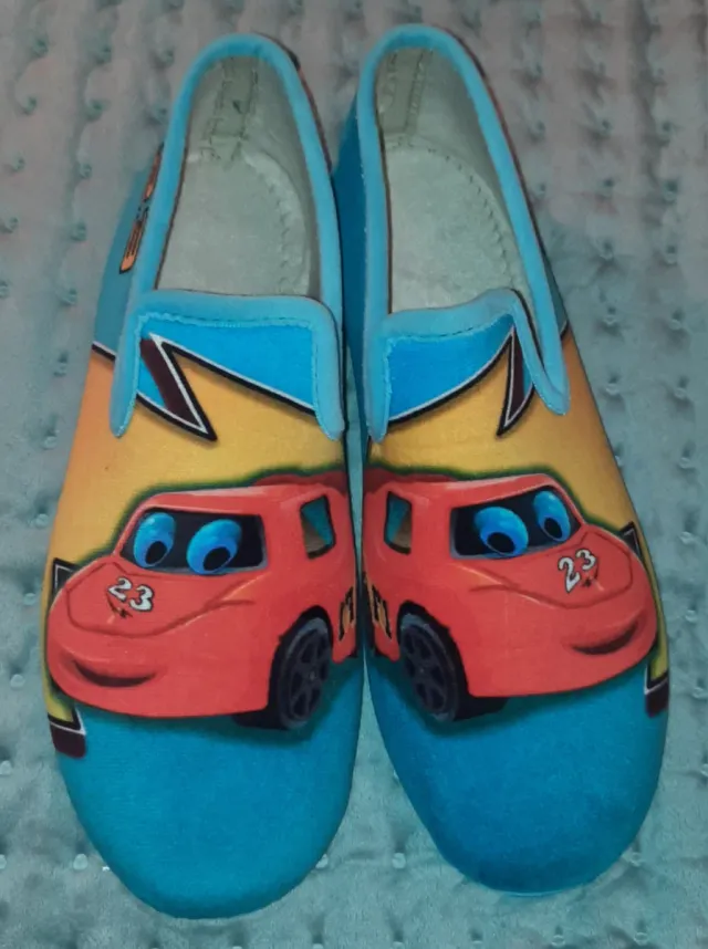 Zapatillas infantiles con diseño de Cars. -Están nuevas,sin estrenar. -Talla 39 de niño. - Personajes de Cars. - Color azul y amarillo.
