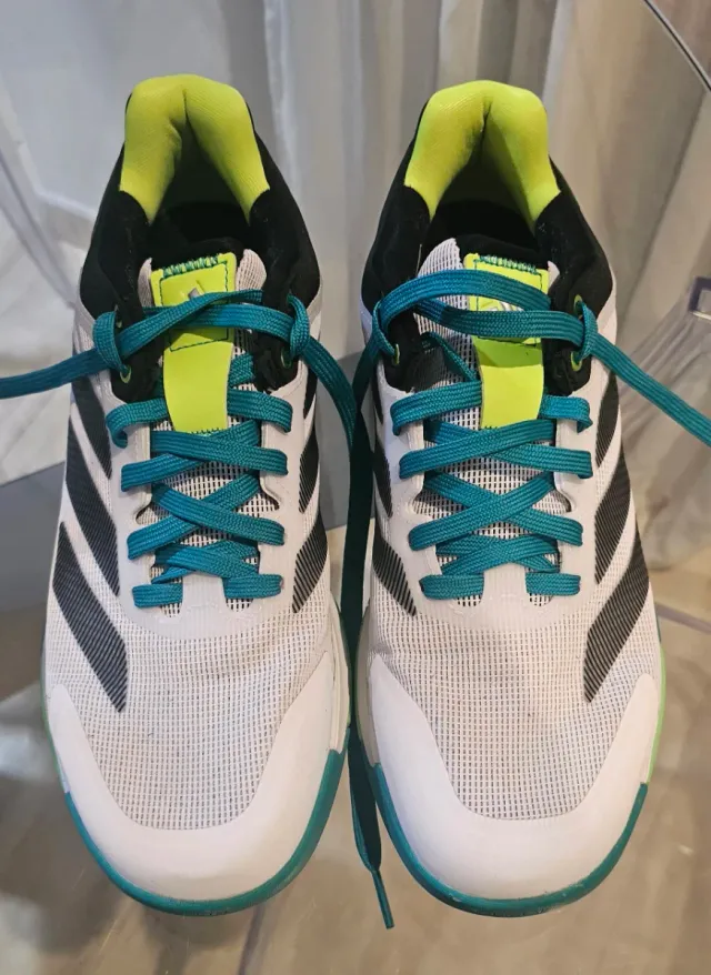 Detalles del productoZapatillas de pádel Adidas Crazy Quick Boost (recuperación de energia) en color blanco con detalles en verde lima y azul.