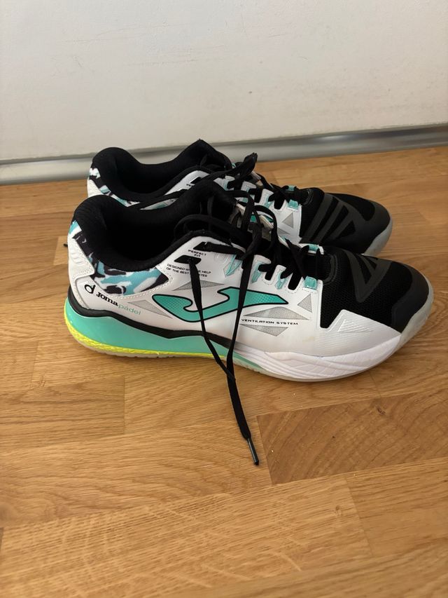 Detalles del productoZapatillas de pádel Joma Spin en color blanco, negro y verde agua.