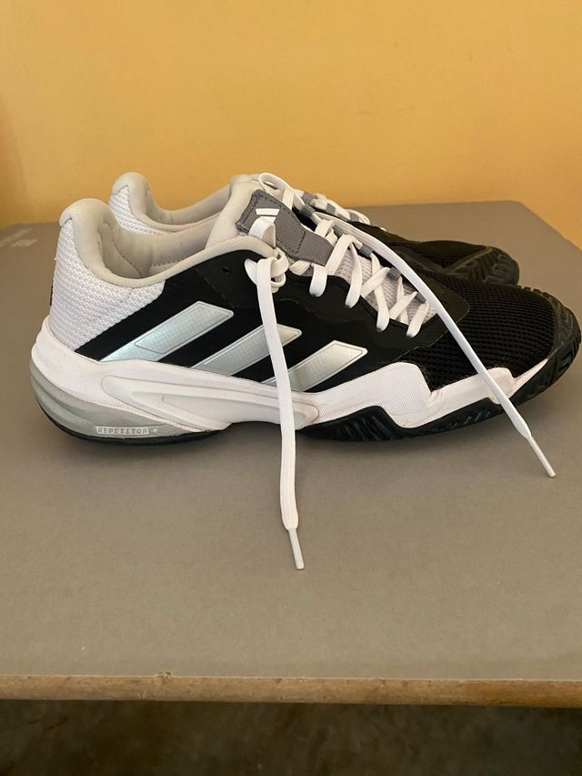 Detalles del productoZapatillas deportivas Adidas en color negro, blanco y plateado, ideales para pádel, frontenis o tenis. Diseñadas para ofrecer comodidad y rendimiento en la pista.