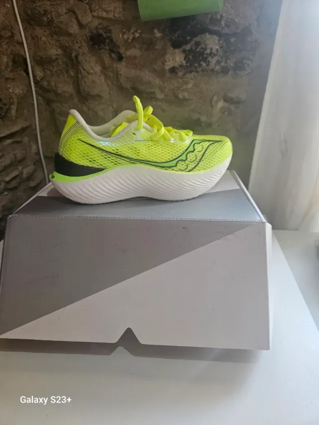 Zapatillas de running Saucony, sin usar y en perfecto estado. - Color amarillo neón. - Diseño deportivo. - Suela blanca.